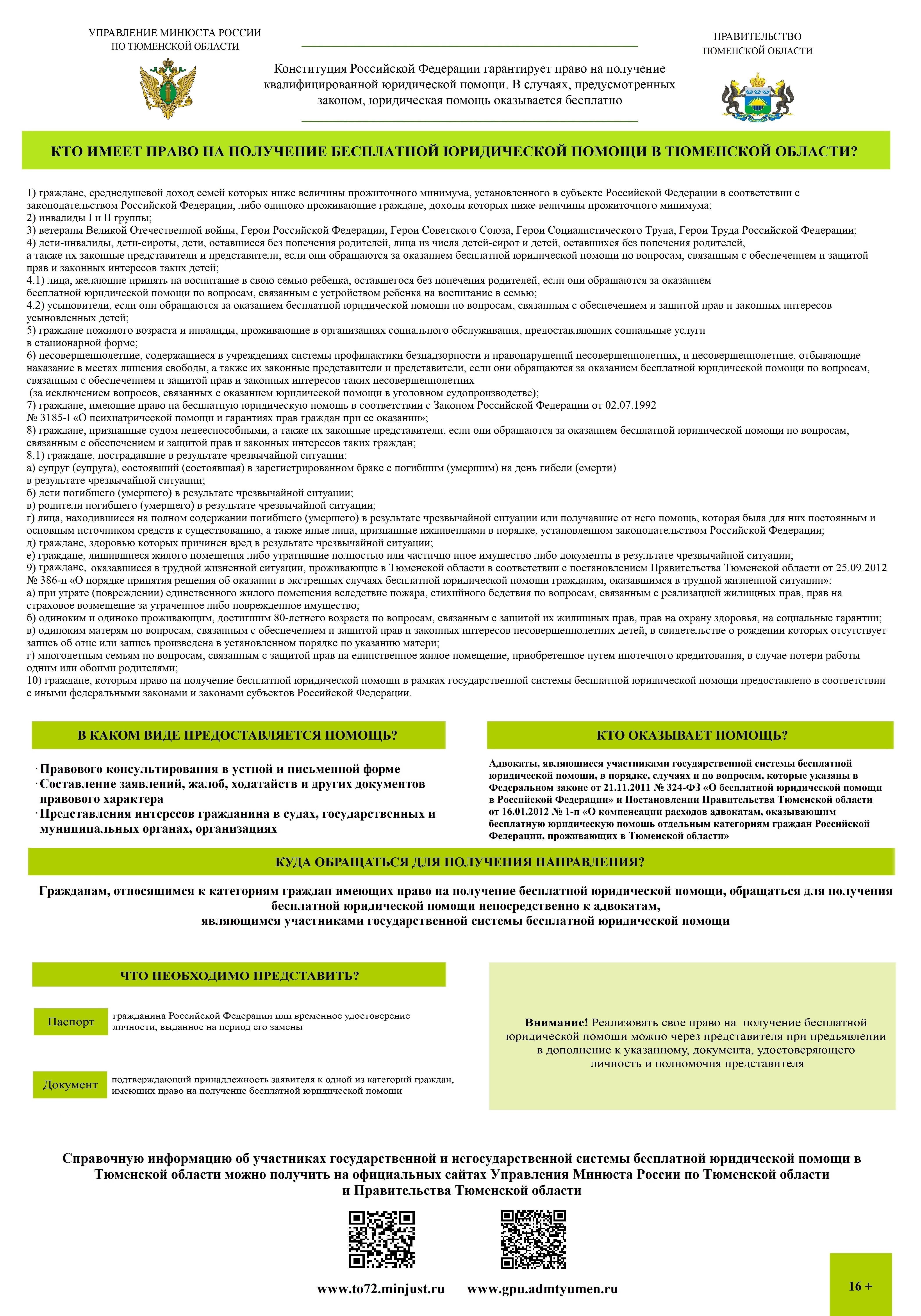 Главным правовым управлением Правительства Тюменской области совместно с Департаментом информатизации Тюменской области запущен новый проект – цифровая платформа «Виртуальное государственное юридическое бюро Тюменской области» по реализации Федерального закона от 21.11.2011 № 324-ФЗ «О бесплатной юридической помощи в Российской Федерации» и Закона Тюменской области от 20.02.2012 № 3 «Об оказании юридической помощи в Тюменской области».