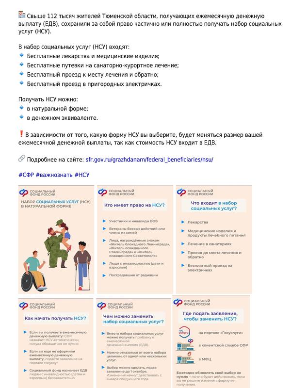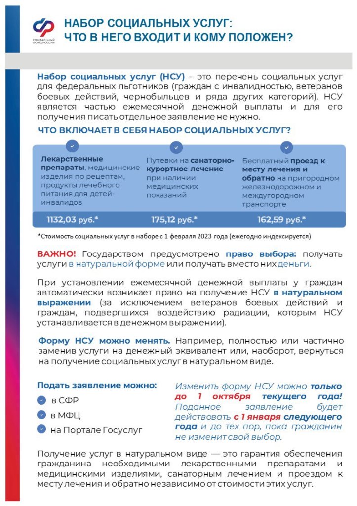 Набор социальных услуг (НСУ) предоставляется получателям ежемесячной денежной выплаты (ЕДВ) и включает в себя: