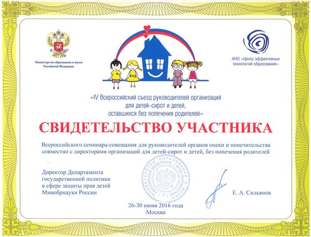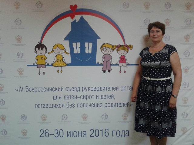 С 26 по 29 июня 2016 года в Москве прошел IV Всероссийский съезд руководителей организаций для детей-сирот и детей, оставшихся без попечения родителей, в котором принимала участие заместитель директора по социальной реабилитации, адаптации и воспитательной работе Калаева Ольга Валентиновна.