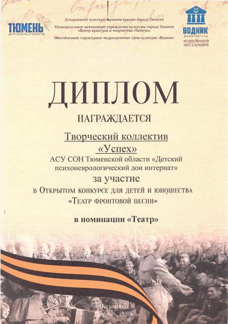 20 апреля творческий коллектив «Успех» Детского психоневрологического дома-интерната принял участие в конкурсе «Театр фронтовой песни», который проходил на базе дома культуры «Водник». Ребята исполнили литературно-музыкальную композицию «Памяти пионеров героев», в которую входили танцы, стихи и песни.