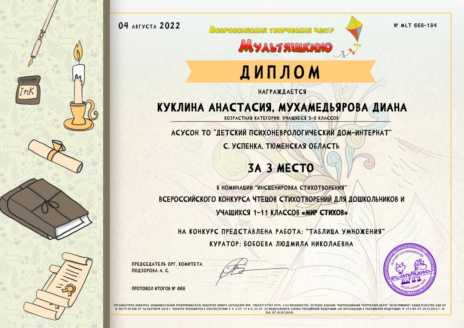 Чтение стихов – это особое искусство. Именно поэтому наши дети любят участвовать в конкурсах чтецов. Всероссийский творческий центр «Мультяшкино» в июле месяце объявил конкурс для дошкольников и учащихся 1-11 классов «Мир стихов». В номинации «инсценировка стихотворения» на суд жюри была представлена работа «Таблица умножения».
