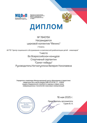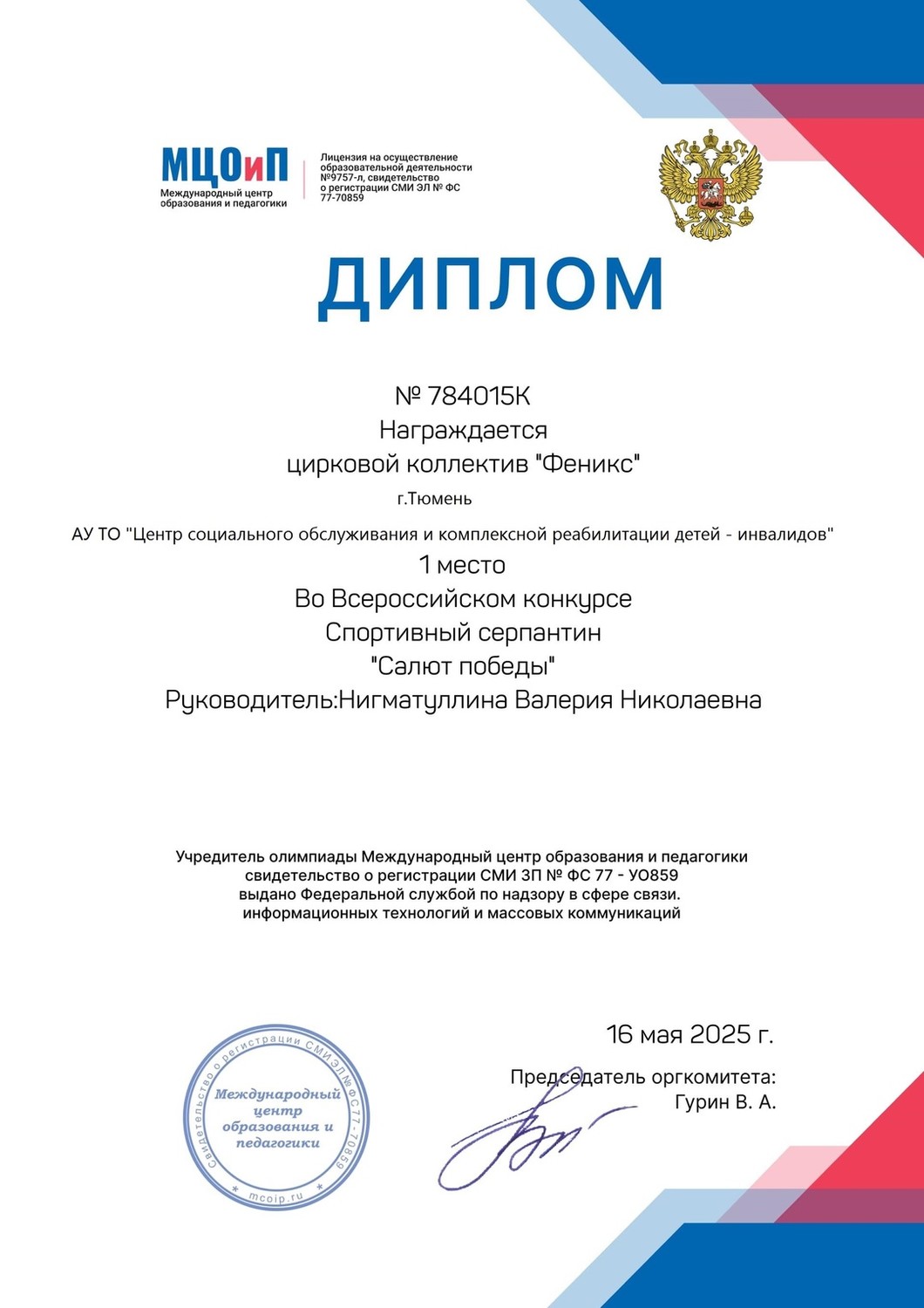Коллектив цирковой студии "Феникс" (руководитель Валерия Николаевна Нигматуллина) получил очередную награду! На этот раз коллектив стал победителем Всероссийского конкурса Спортивный серпантин "Салют Победы".