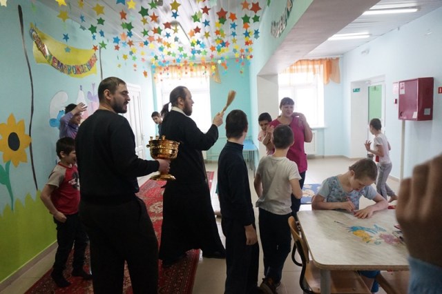 20 января прихожане храма Храма Успения Пресвятой-Богородицы во главе с настоятелем отцом Вячеславом посетили Детский психоневрологический дом-интернат. С пением праздничного тропаря они помещения все учреждение, батюшка окропил каждую комнату, всех подопечных и сотрудников святой крещенской водой и поздравил всех пребывающих там с праздником Крещения Господня. |