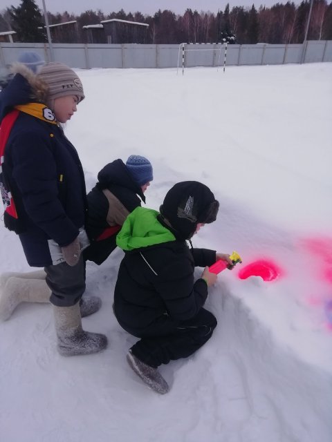 Обычно мы с воспитанниками нашего детского дома рисуем палочками или вытаптываем рисунки следами, а недавно освоили новый вид творчества, который очень впечатлил детей: мы стали рисовать на снегу красками! Организовать процесс очень легко, а сколько удовольствия получают ребята!