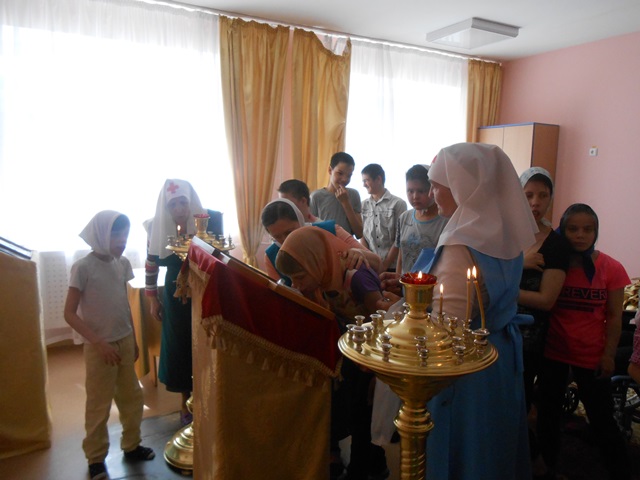 25 мая Детский психоневрологический дом-интернат в очередной раз посетили сестры милосердия из Знаменского кафедрального собора. Они обошли группы маломобильных детей, посетили группу временного пребывания. Сестры милосердия привезли с собой святой воды и окропили детей, после проведения службы в молебной комнате. |
