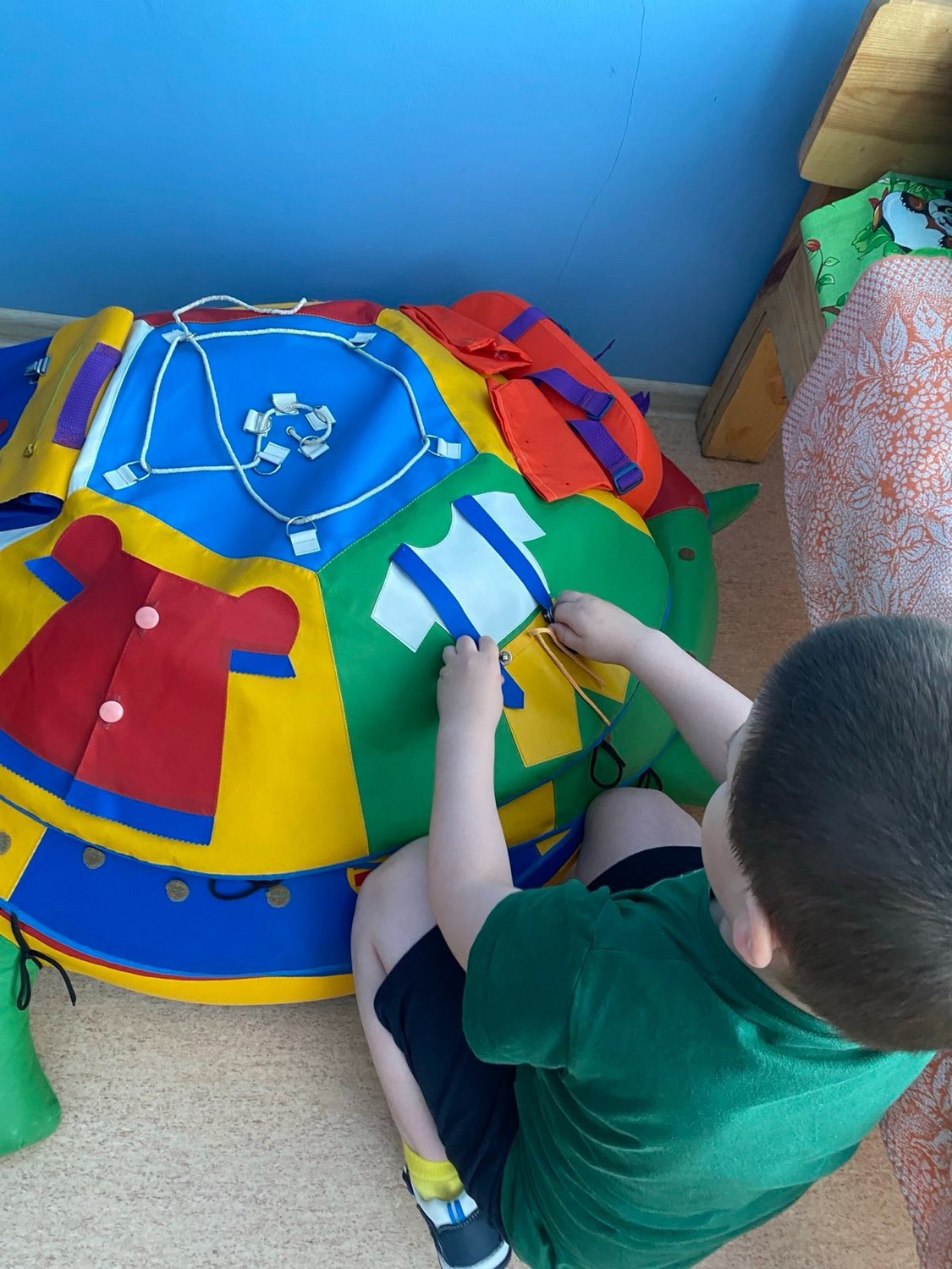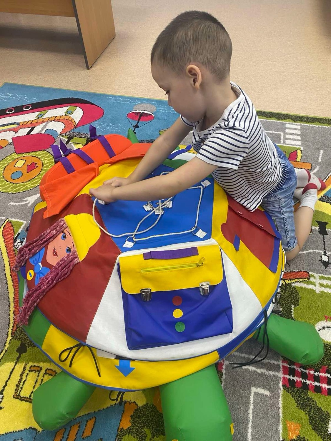 На ней размещены: липучки, молнии, шнуровки, кнопки и многое другое. Открывая и закрывая молнии, развязывая и завязывая шнуровки, ребенок изучает свойства предметов, их форму и цвет, постепенно знакомится с вещами и предметами.