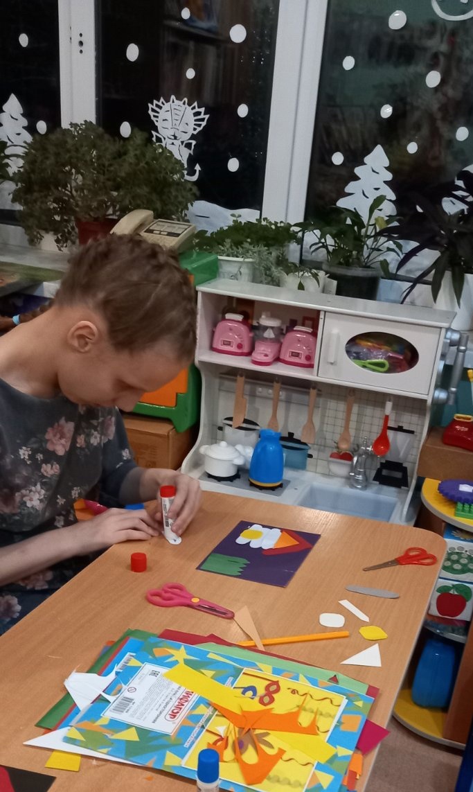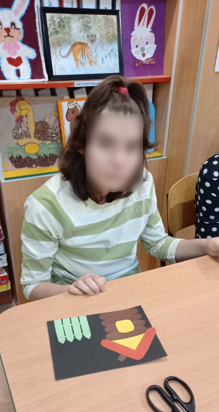 На практической части занятия воспитанники выполняли аппликацию «Избушка». В работе использовали: цветню бумагу, картон, клей, ножницы. Аппликации выполнялись на основе разного цвета. После повторения основных цветов, ребятам было предложено самостоятельно выбрать цвет избушки, сделать детали, используя шаблоны с учетом цвета основы.