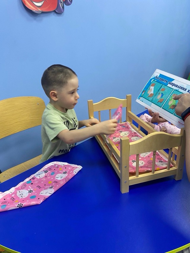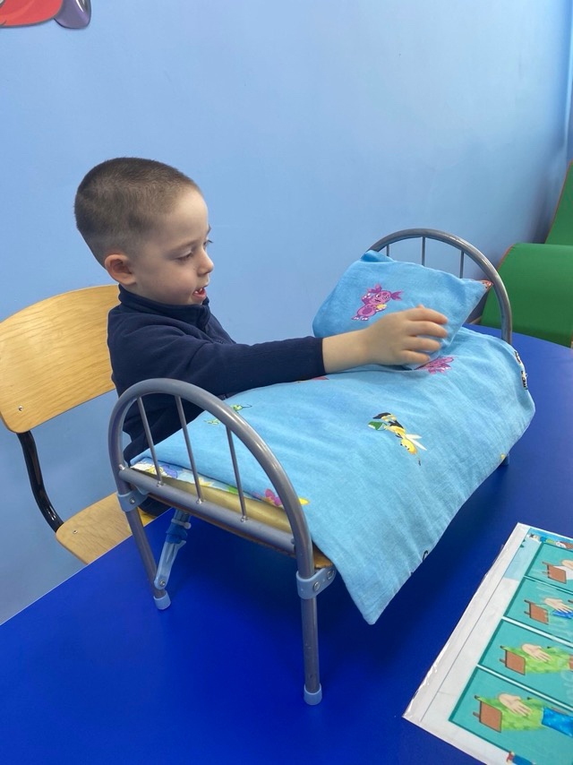 - «оттачиваем» навык на заправке игрушечной кроватке;