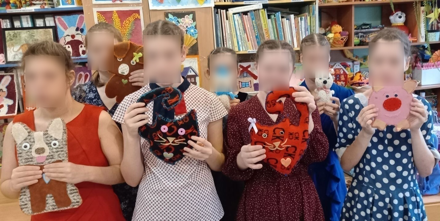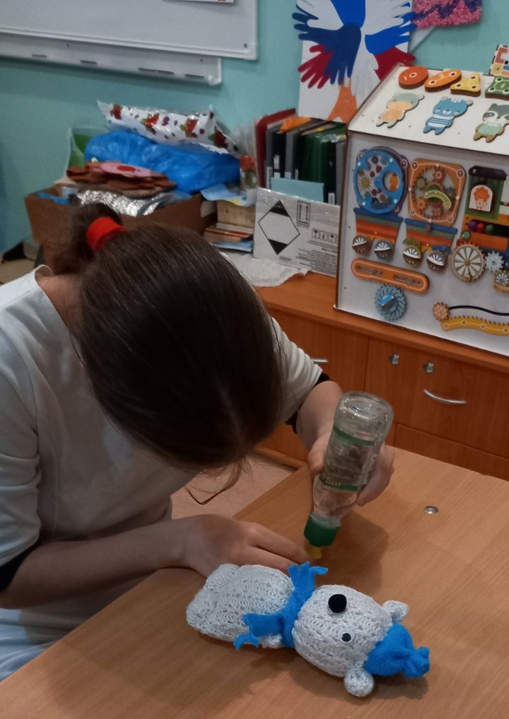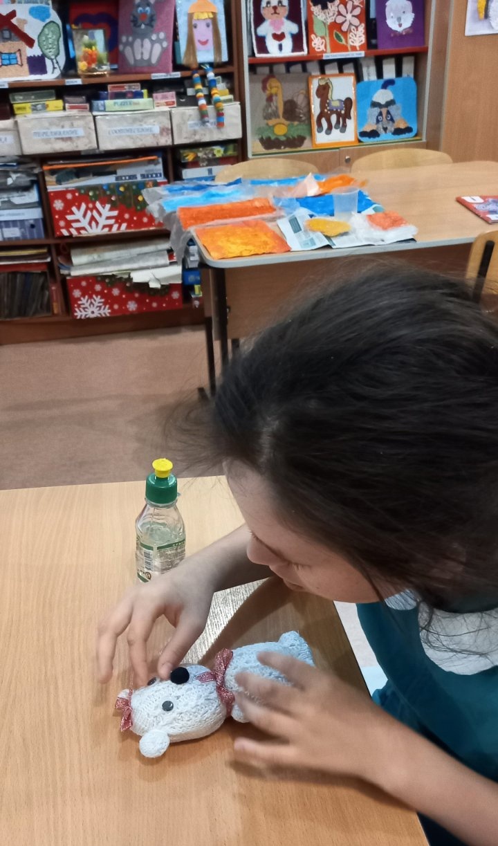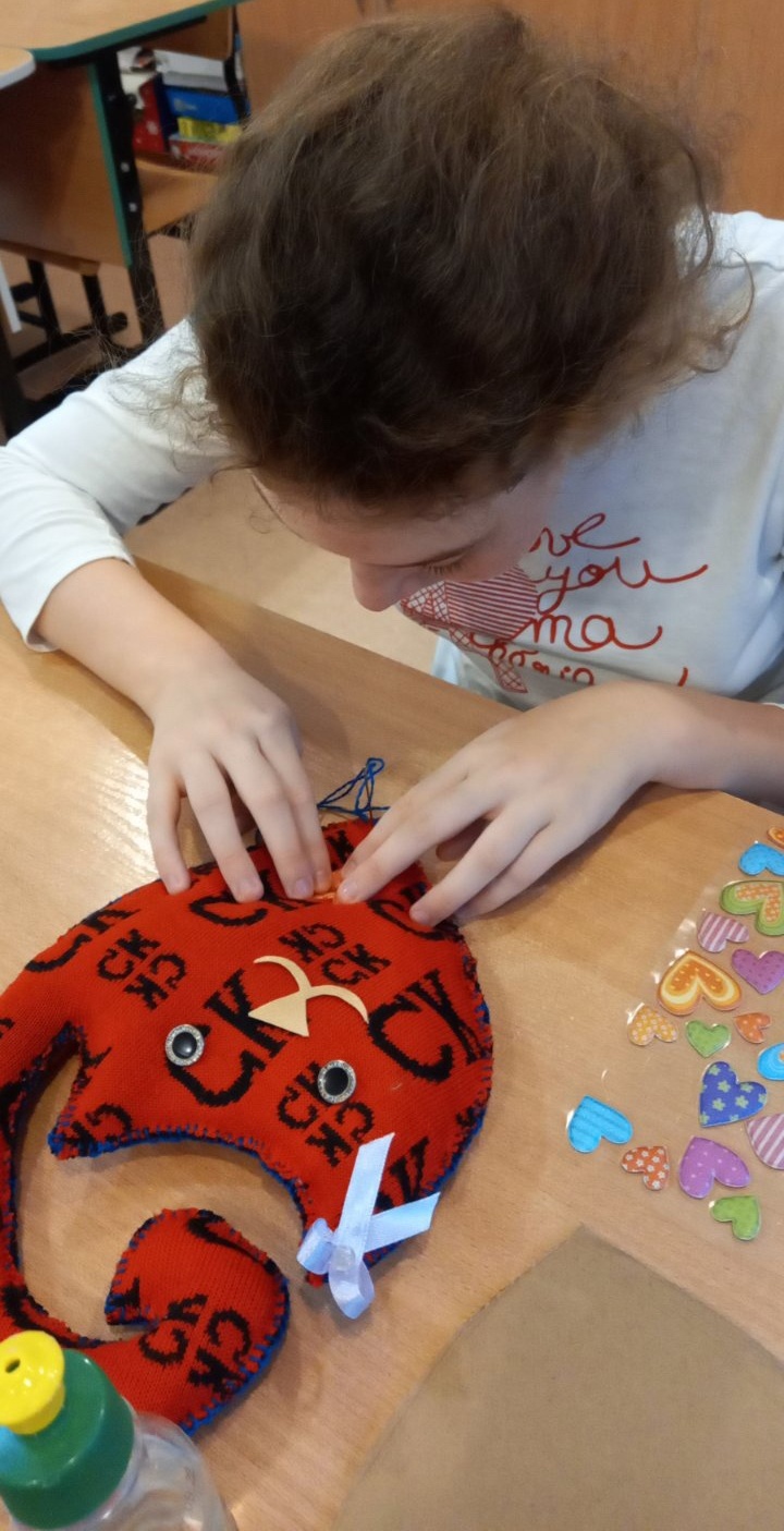 Очень творческим и занимательным было занятие, на котором игрушки мастерили из текстильного материала. Нина и Алена шили котиков из ткани. Вика и Лена делали белых медвежат из рукавичек. У Наташи и Вики получились собачки из драпа.