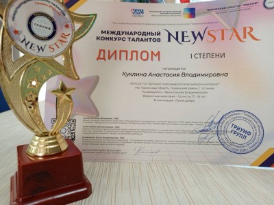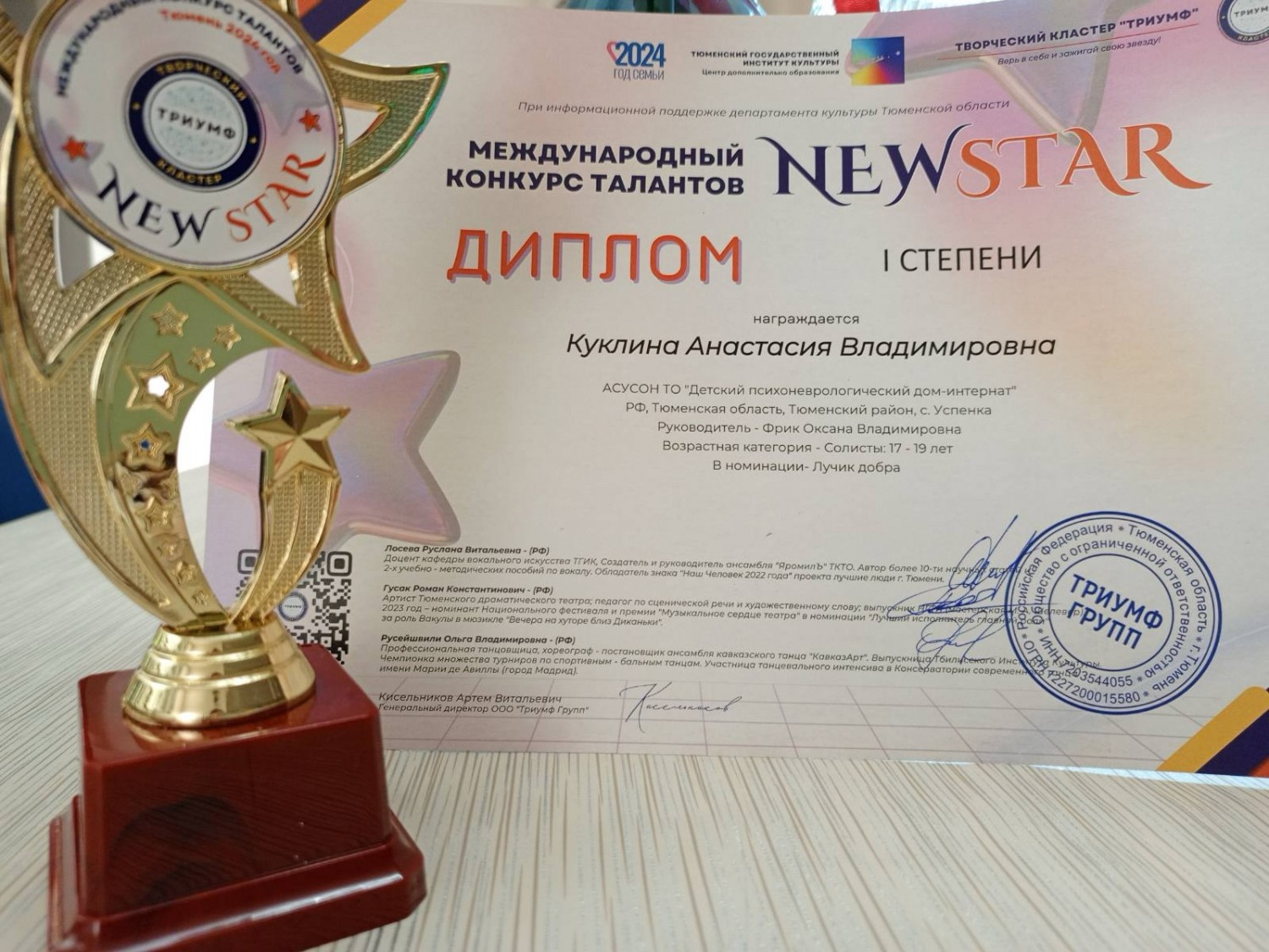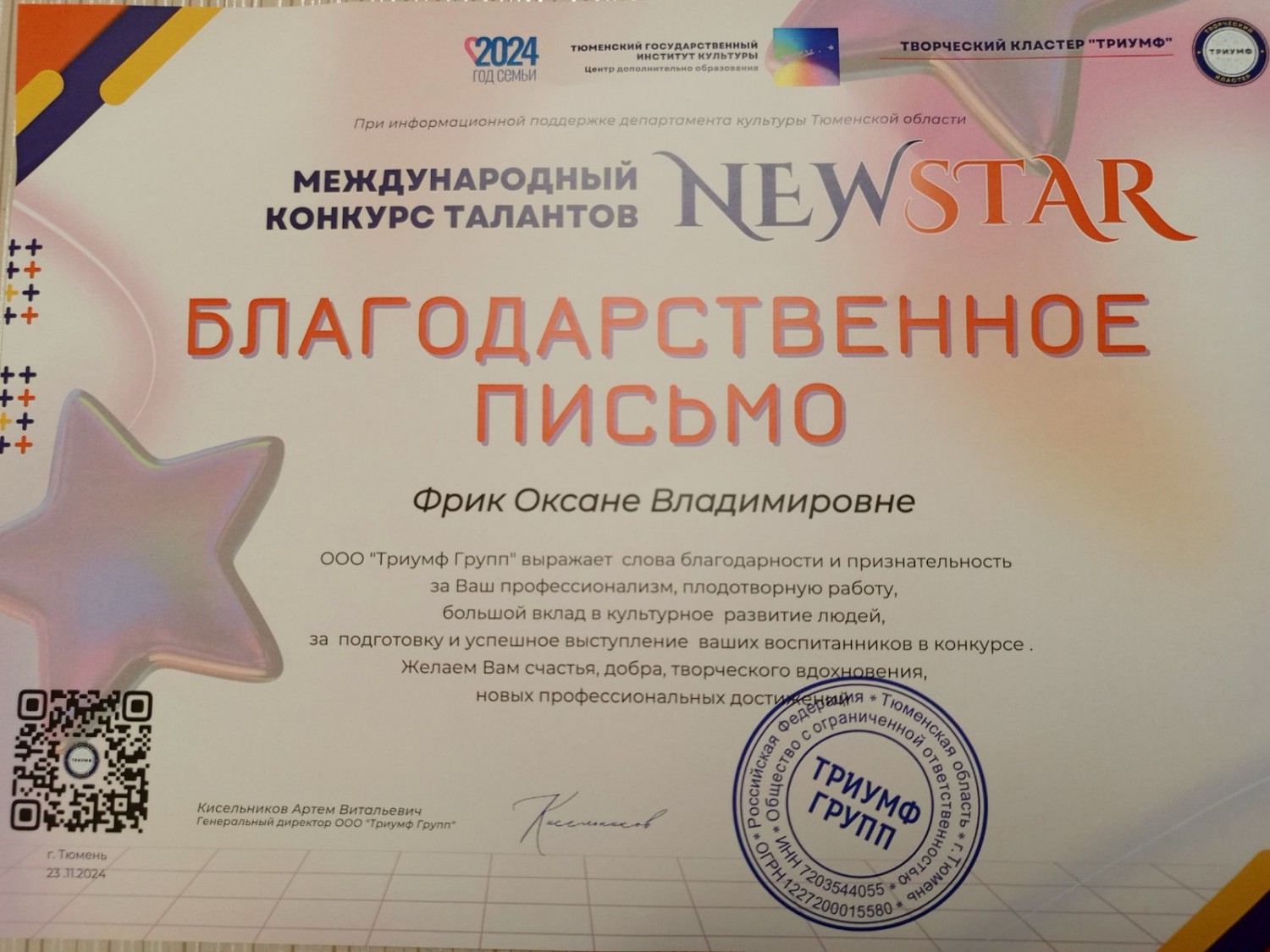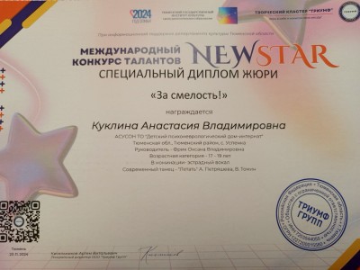 23 ноября 2024 г. в Тюмени на площадке Молодежного театрального центра «Космос» прошел Международный конкурс талантов «New Star», в котором с большим успехом выступила наша воспитанница – Куклина Анастасия.
