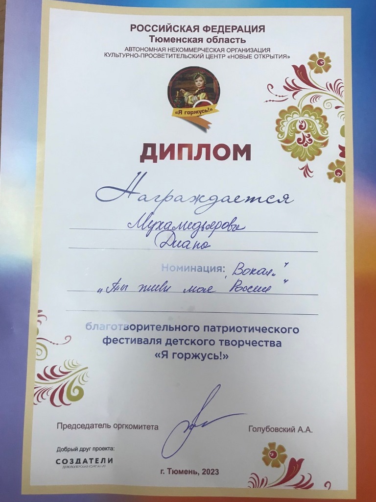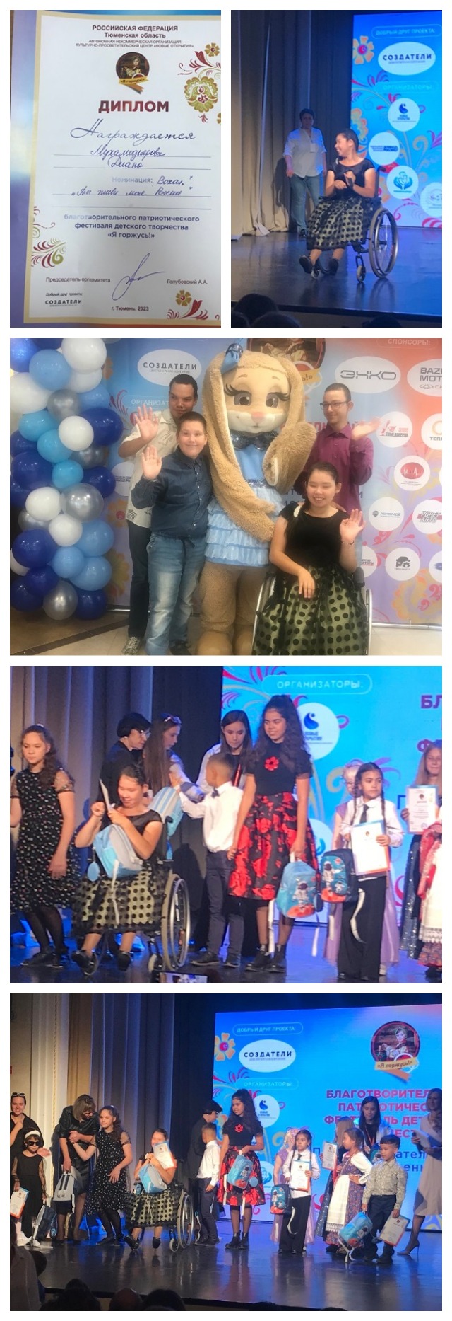 Воспитанница дома-интерната Мухамедьярова Диана приняла участие в благотворительном патриотическом фестивале детского творчества «Я горжусь!». Диана стала лауреатом в номинации «Вокал», исполнив песню «Ты живи, моя Россия».