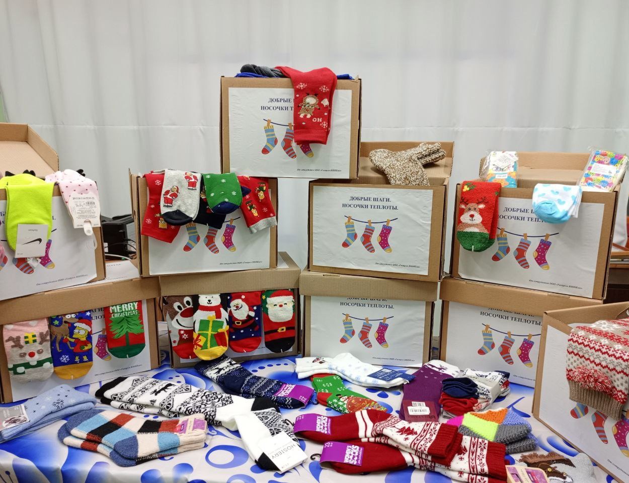 «Почему именно носочки?» - спросите вы, – поясняет нам Евстафьева Ксения Анатольевна, организатор этой оригинальной благотворительной акции, научный сотрудник компании. «Всем известно, что детям-непоседам не сидится на месте, они постоянно в движении, носки имеют свойство изнашиваться и теряться, к тому же, не так уж накладно каждой семье купить или связать тёплые носочки. Чтобы благотворительная акция удалась, мы составили и разместили яркие объявления для каждого отдела нашей организации. И вот новые разноцветные носочки собирались в каждом уголке нашего офиса. Их разнообразие удивляло и радовало: самые разные детские размеры, цвета и виды. От обычных тоненьких хлопчатобумажных до тёплых вязаных шерстяных».