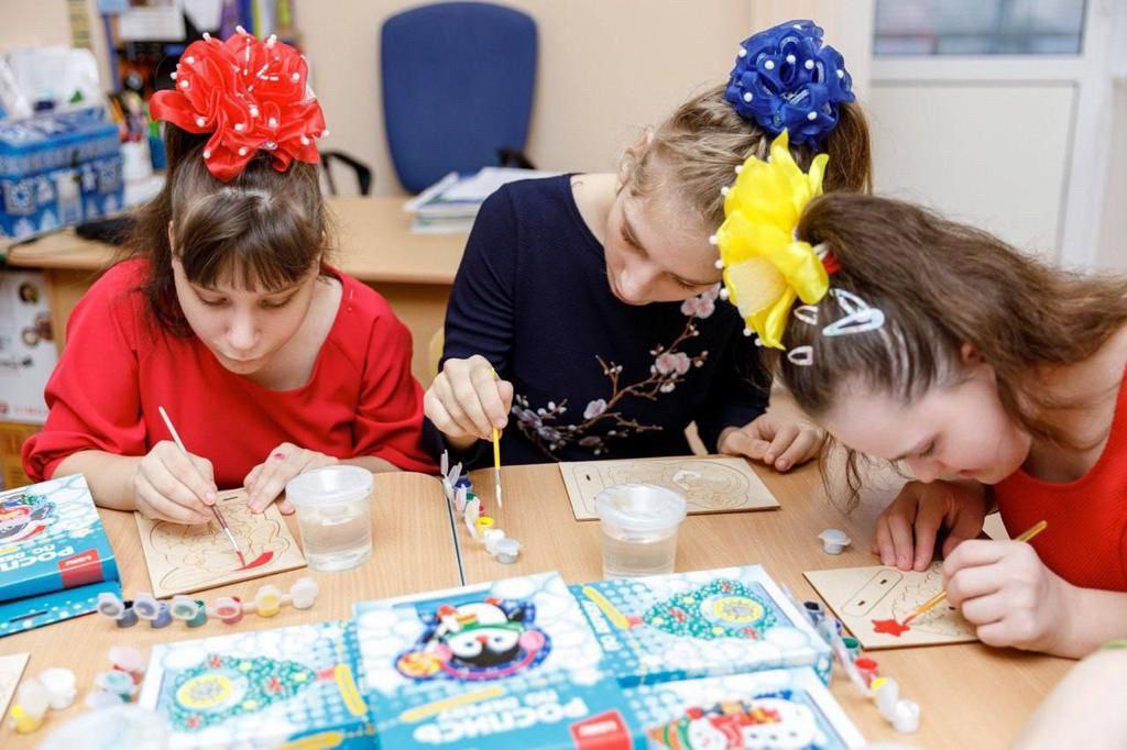 Учебные классы друзья главного зимнего волшебника превратили в уютные творческие студии, где ребята мастерили новогодние игрушки и разрисовывали шоколадные открытки съедобными красками, а актовый зал — в резиденцию сказочной феи с мыльными пузырями и научную лабораторию профессора Открывашкина.