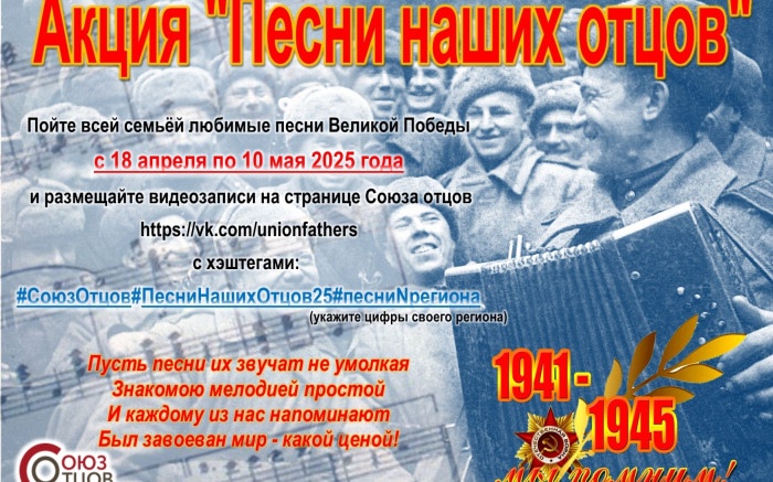 Всероссийская общественная организация «Союз отцов» приглашает семьи всей страны присоединиться к акции «Песни наших отцов». Спойте любимые песни ваших дедов и отцов — те, что звучали на фронтовых привалах, в праздничные майские дни или в кругу друзей, вспоминающих о защите Родины.