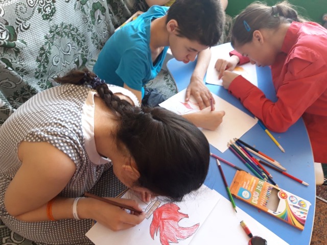Рассказ о Дне Победы, знакомство с атрибутами этого великого праздника играют важную роль в патриотическом воспитании детей нашего дома-интерната. В канун Великого праздника ребята активно подключились к участию в международном конкурсе семейного творчества «Рисуем с детьми Вечный огонь». |