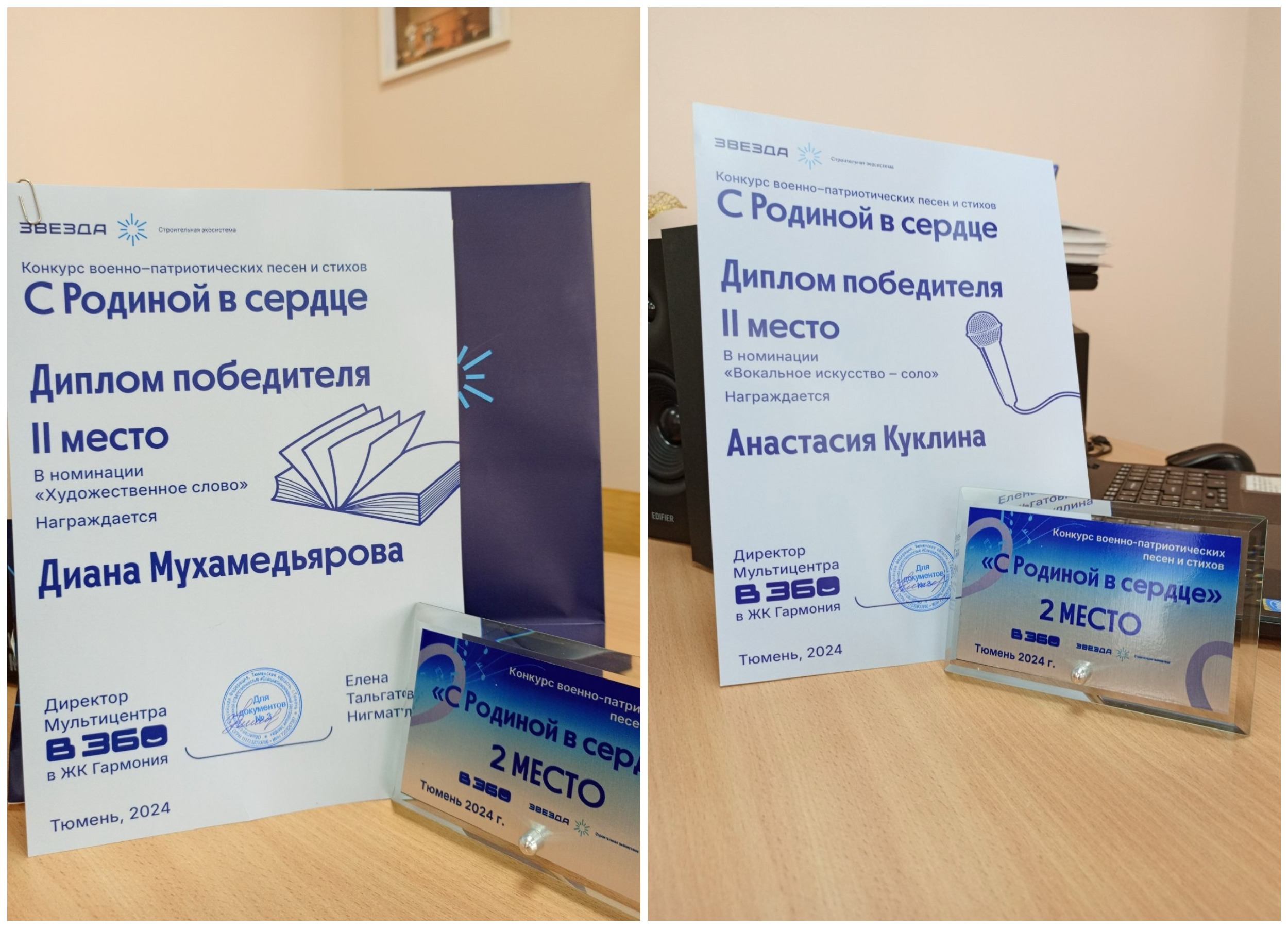 В г. Тюмени подведены итоги патриотического конкурса «С Родиной в сердце», в котором приняли участие две наши воспитанницы: Куклина Анастасия в номинации «Вокальное исполнительство» и Мухамедьярова Диана в номинации «Художественное слово».