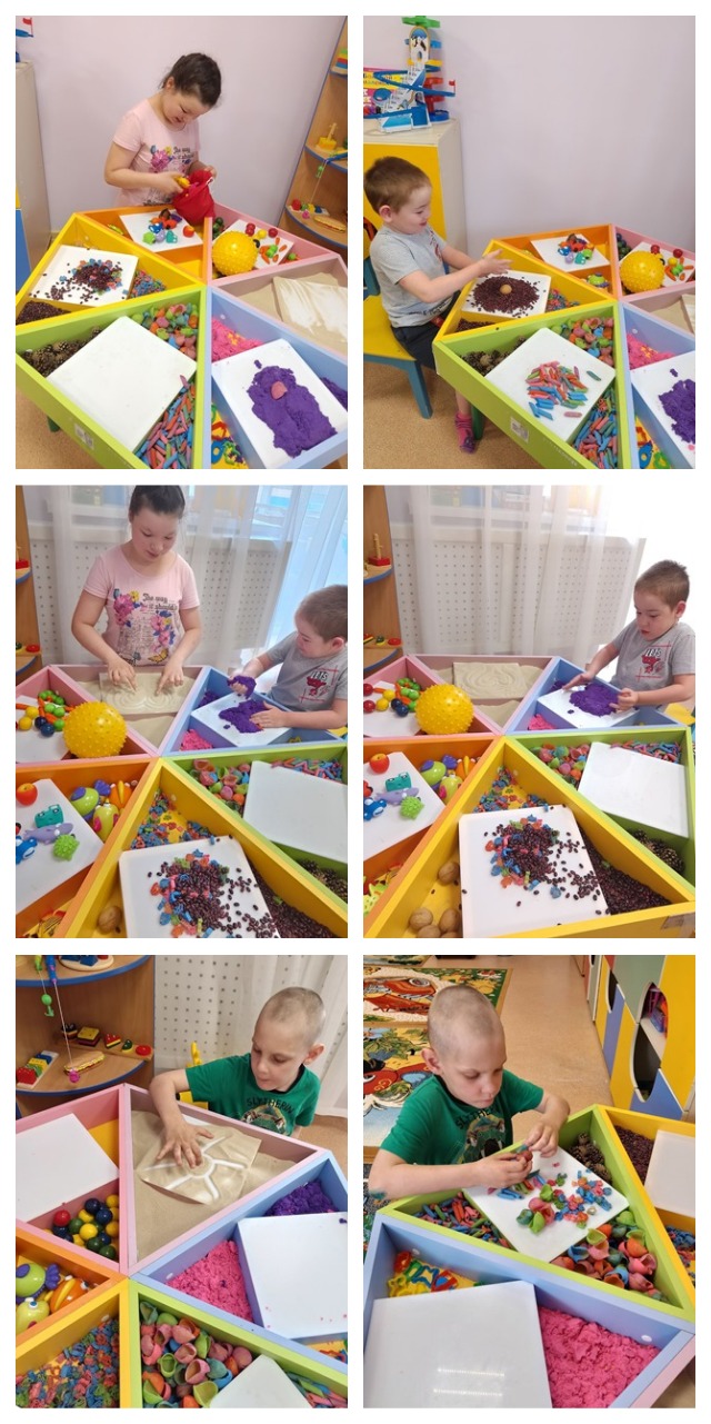 Большинство занятий с дефектологом в учреждении проводятся для улучшения сенсорной чувствительности, развития тактильных ощущений. На занятиях используется различный материал: пластик, дерево, резина. Кроме готового стимульного материала применяются подручные средства. Особенно приятны и полезны в игре песок, крупа, крупные и мелкие макаронные изделия, шишки, орехи, так как предметы созданные природой. Они обладают естественной текстурой, красками, они отражают реалистичную картину мира, помогают познанию окружающей действительности. |