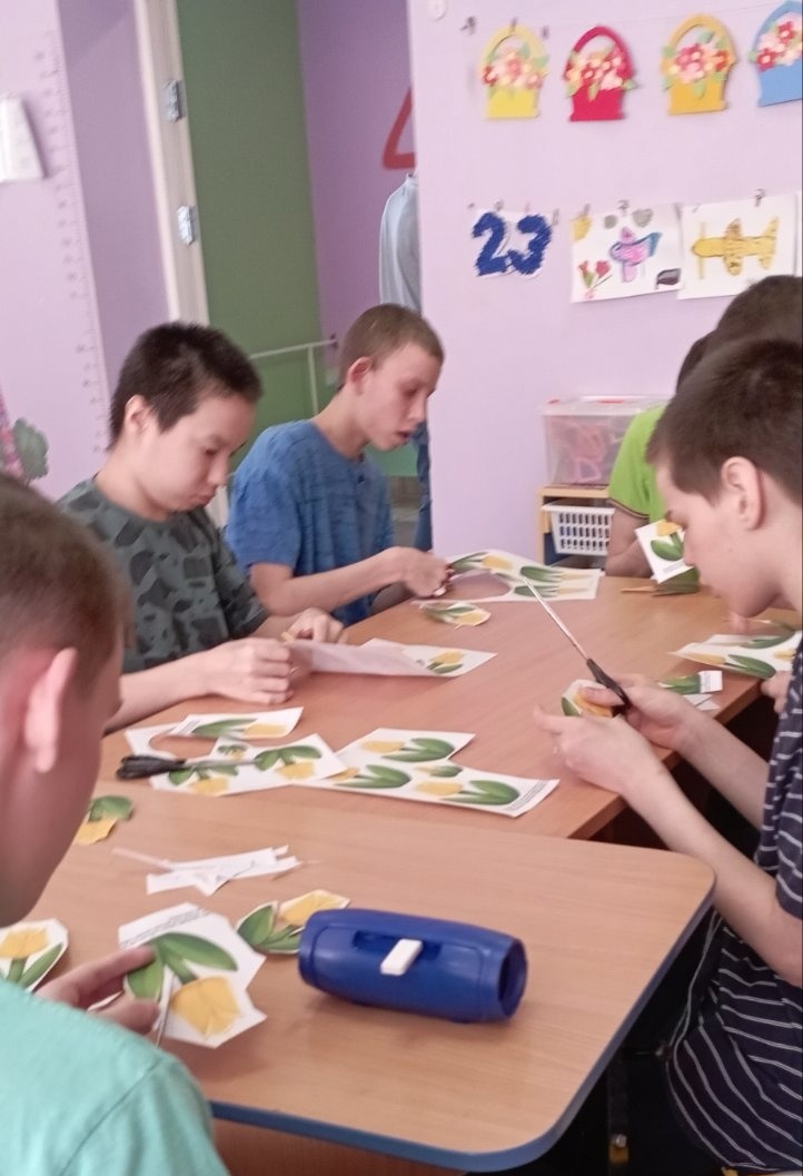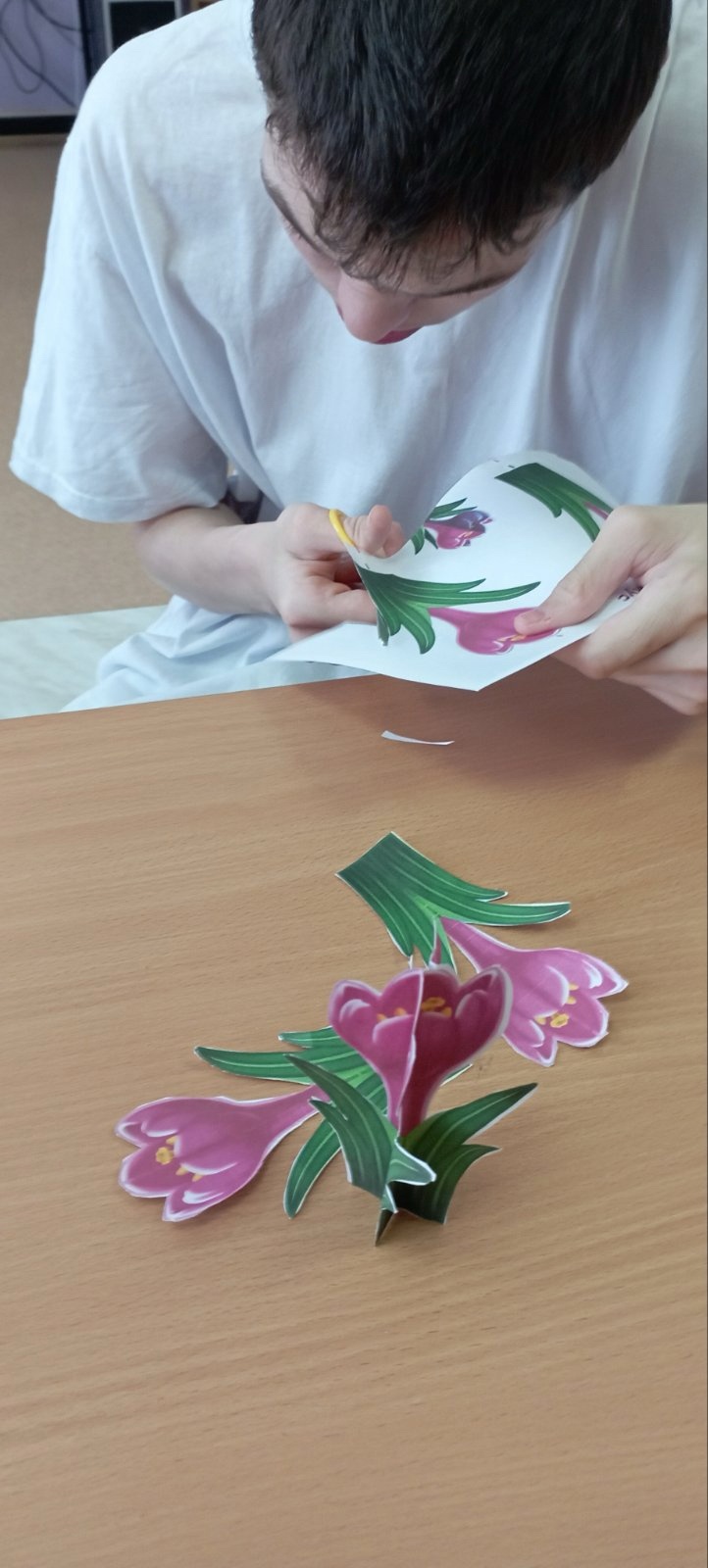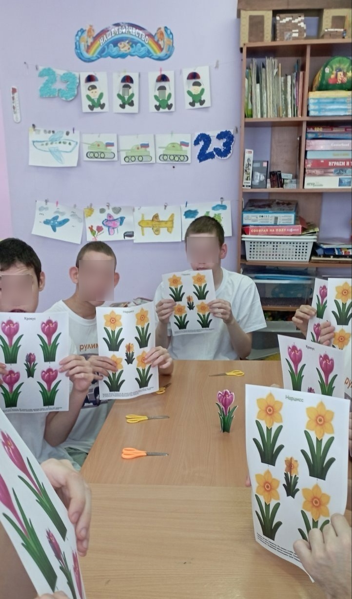 Аккуратно работая ножницами и клеем, мальчики с особым трепетом собирали нежные весенние цветы. Техника выполнения была для ребят сложной и требовала внимательности и аккуратности. Цветы получились очень яркие и красивые.