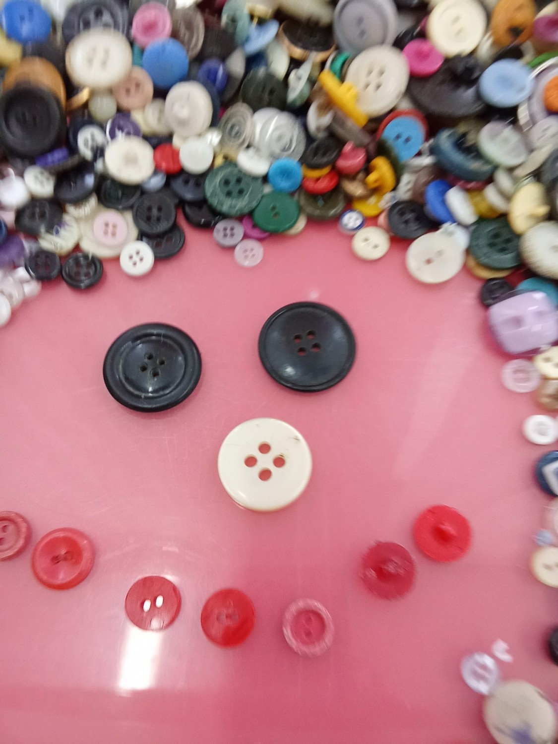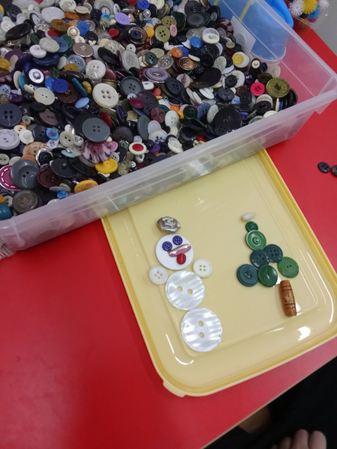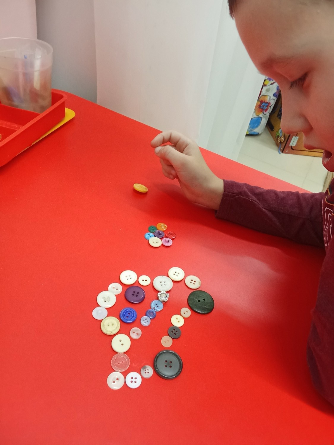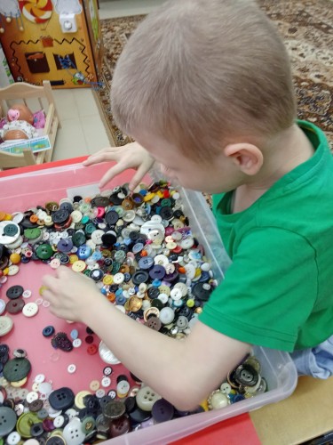 Ищем в коробке с «волшебными» пуговками самую большую, самую маленькую, самую блестящую пуговку, а можно выложить из пуговиц разнообразные фигуры и узоры.